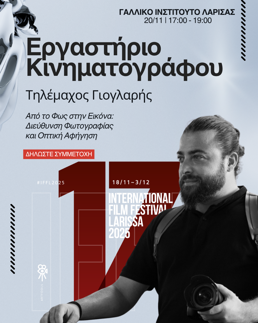 • 20/11 Εργαστήριο Κινηματογράφου – Τηλέμαχος Γιογλαρής (Κινηματογραφιστής) Γαλλικό Ινστιτούτο Λάρισας 17:00 - 19:00.