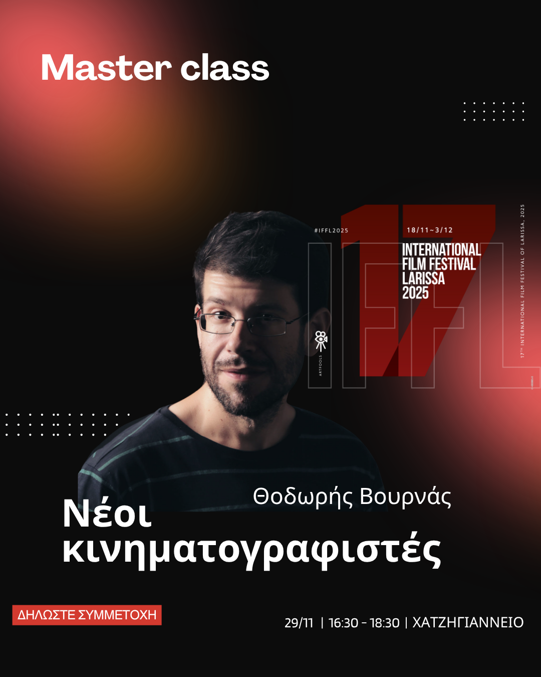 • 29/11  Master class Νέοι κινηματογραφιστές ΧΑΤΖΗΓΙΑΝΝΕΙΟ Θοδωρής Βουρνάς. 16:30 - 18:30