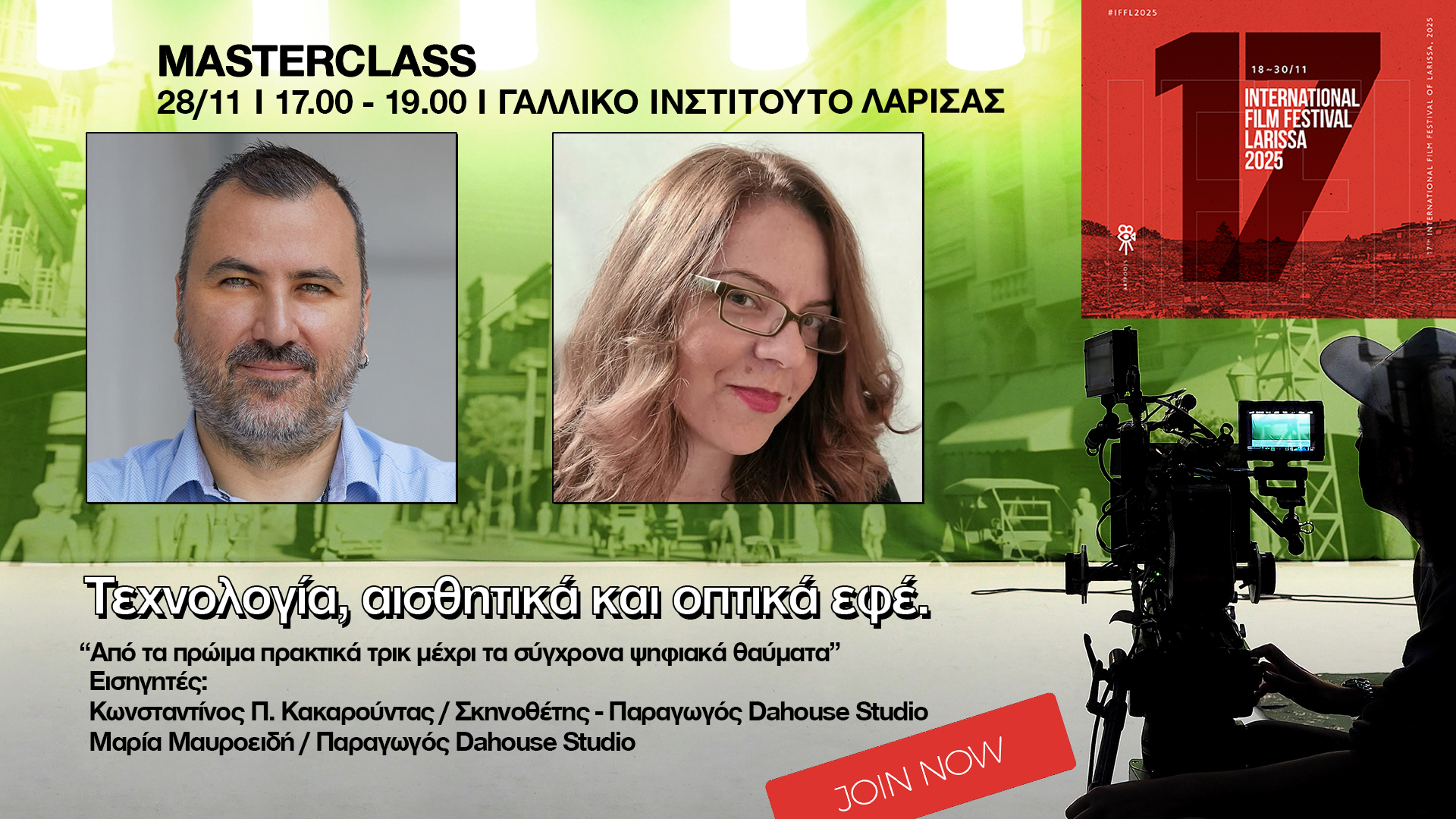 • 28/11 Masterclass: Τεχνολογία, αισθητικά και οπτικά εφέ – Κ. Κακαρούντας και Μ. Μαυροειδή  Γαλλικό Ινστιτούτο Λάρισας ΑΠΟΓΕΥΜΑ. 17:00 - 19:00.